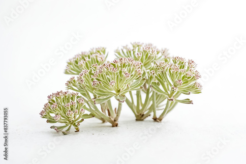 Closeup of Small Green Succulent Plant with Delicate Pink Blossoms