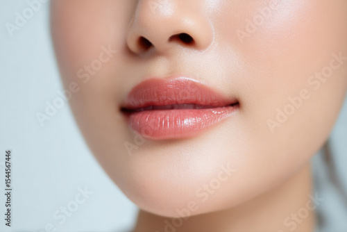Close-up of smooth, radiant skin and natural pink lips, highlighting healthy facial skin texture and subtle makeup.