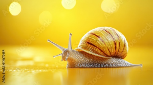 Close-up of snail with shell on yellow background