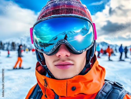 Close-Up of Snowboarder in Frosty Environment Wearing Goggles with Reflective Lens, Capturing the Thrill and Adventure of Winter Sports in Majestic Mountains