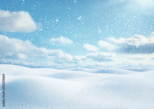Close-up of snow-covered ground with falling snowflakes and a blue sky background Generative AI