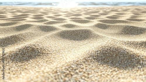 Close-up of soft, golden sand on a beach with the ocean in the background.