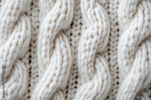 Close-up of soft white thick wool yarn knitted in a braided cable pattern creating a warm and cozy texture