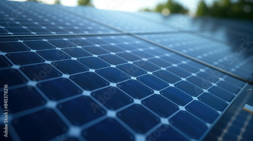 Closeup of Solar Panels in a Sunny Field with Trees in the Background.