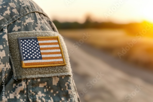 Close-Up of Soldier Uniform with American Flag Patch Against Sunset Background