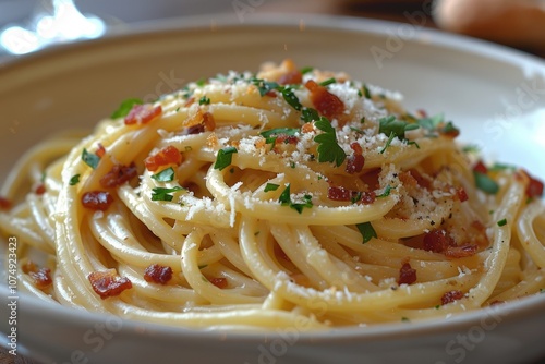 Close-up of Spaghetti with Bacon, Parsley, and Parmesan Cheese