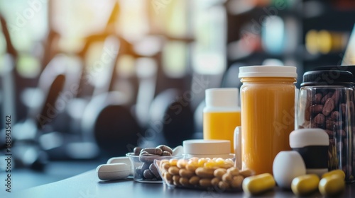 Close-up of sports nutrition products such as shakes, energy bars on blurred background