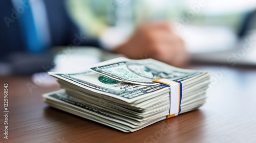 Close-up of Stacked Dollar Bills on a Wooden Desk with Businessman in the Background Blurred Out of Focus