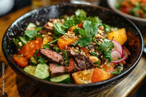 Close-up of Steak Salad with Tomatoes, Cucumbers, and Cilantro
