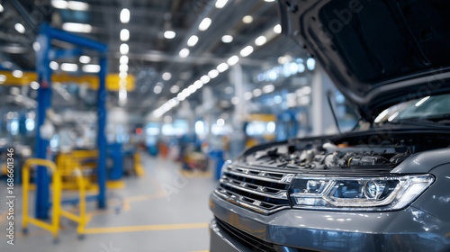 Close-up of SUV engine in repair shop, metallic components gleaming under workshop lights, modern design and advanced automotive technology highlighted