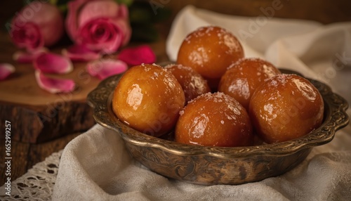 Closeup of sweet Gulab Jamun dessert in metal bowl. Golden-brown fried milk balls soaked in sugar syrup, sprinkled with sugar crystals. Traditional Indian cuisine, cultural delicacy, popular sweet