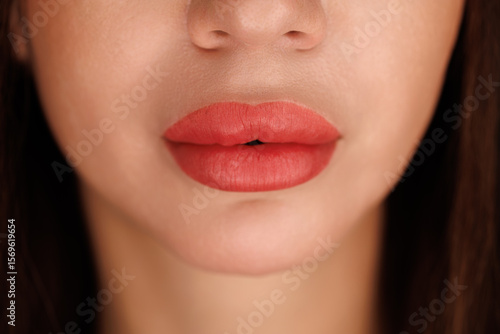 Closeup of symmetrical, full lips after enhancement with pink pigment and smooth finish.