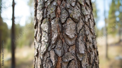 Close-up of textured tree bark with a blurred forest background, showcasing natural patterns and earthy hues.