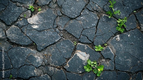 Close-Up of Textured, Weathered Asphalt Surface with Green Plants