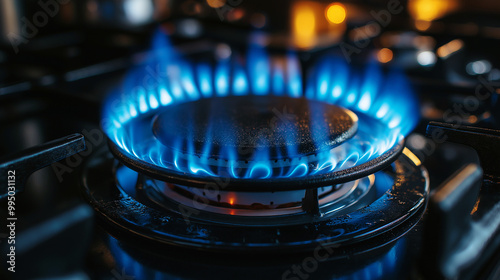 Closeup of the blue fire on a kitchen stove burner