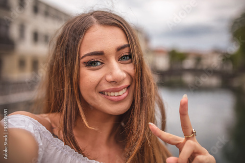 Close-up of the girl taking a beautiful selfie.
