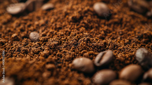 Close-up of the grainy texture of ground coffee beans with rich brown hues