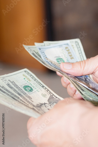Close-up of the hands of a person counting American money. Concept of economy. Salary