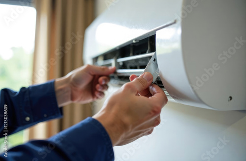 Close-up of the hands of a repairman repairing an air conditioner. Air conditioner maintenance.