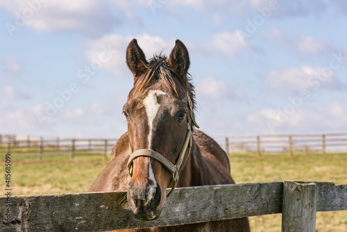 Close-up of the head of a bay Thoroughbred broodmare with a white blaze looking over a wood fence in a pasture in Kentucky.