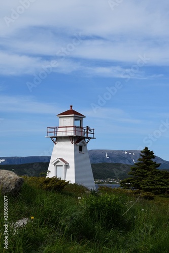 closeup of the red and white lighthouse in Woody Point, Gros Morne National Park Newfoundland and Labrador Canada