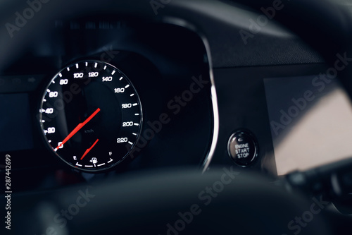 Close-up of the speedometer on the dashboard of a modern expensive car. The dashboard illumination is reflected. Front background is blurred