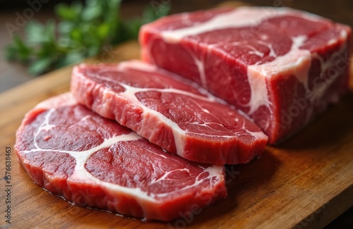 Close-up of thick cut rib eye steaks ready for cooking. Features raw beef with marbling on a rustic wooden cutting board. Fresh ingredient for gourmet dinner, barbecue, or kitchen preparation.