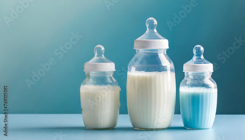 Close-up of three baby bottles with milk on light blue background. Feeding time.