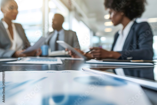 Close-up of three businesspeople sitting around an office table, using a digital tablet and discussing a marketing plan in a modern conference room.