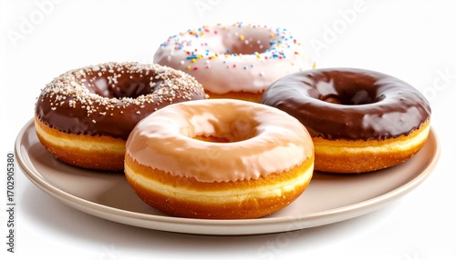 Closeup Of Three Delicious Donuts On A Ceramic Plate In Front Of An Isolated White Background