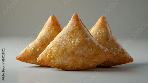 Close-up of three golden crispy samosas stacked on a white surface with a plain background, showcasing detailed textures and delicious appearance, ideal for snack or street food themes