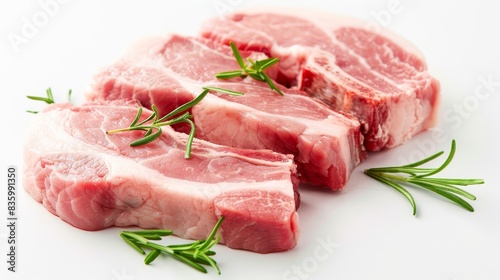 Close-up of three raw lamb chops with sprigs of rosemary on a white background