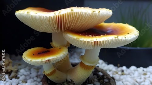 Closeup of Three Vibrant Orange Mushrooms Growing in Pot