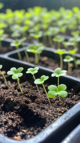close-up of tiny green seedlings sprouting from rich, dark soil in small pots