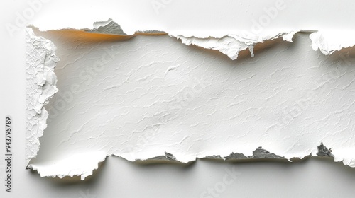Close-up of torn white paper with rough edges, isolated on a white background, ideal for text space or creative design projects.