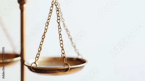 Close-up of traditional brass scales, one side raised slightly, set against a simple white backdrop. No people.