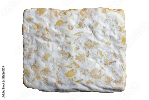 Close-Up of Traditional Fresh Tempeh Fermented Soybeans with Rhizopus Mold Texture - Food Texture Background.