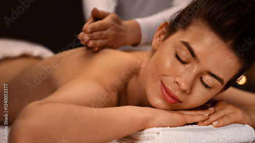 Closeup of tranquil young woman enjoying relaxing body massage at spa