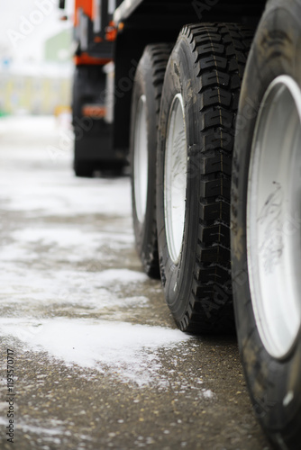 Close-Up of Truck Tires on Snowy Ground in an Industrial Setting