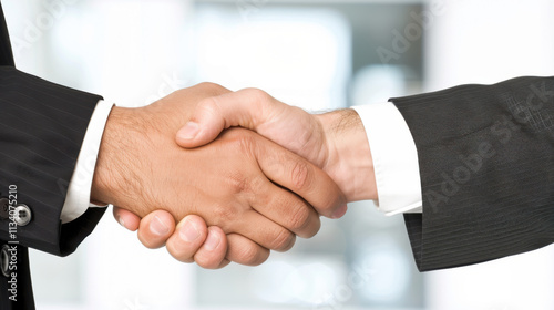 Close-up of two businessmen shaking hands in a modern office, symbolizing a successful merger deal, professional and clean atmosphere.