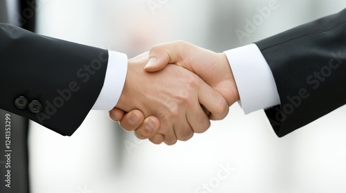 Close-up of two businessmen shaking hands, signifying a deal or agreement.