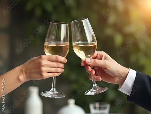 Close-up of two graceful hands, female and male, holding crystal glasses of wine