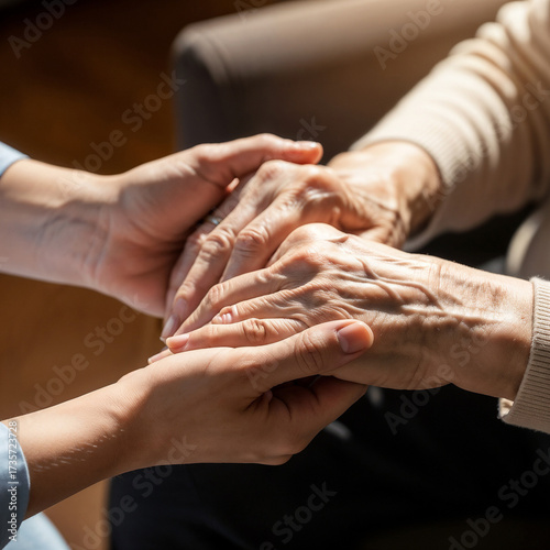Close-up of two hands holding each other — a young caregiver’s hand gently supporting the wrinkled hand of an elderly person.