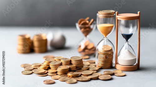 Close-up of two hourglasses and stacks of gold coins on a gray surface, symbolizing the concept of time and money management.