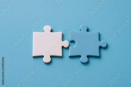 Close-up of two interconnected puzzle pieces isolated on a blue background.