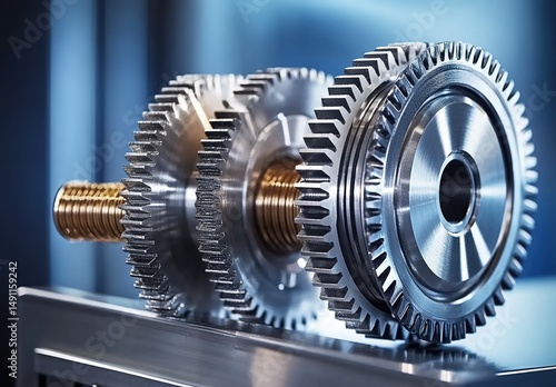 Close-up of two metallic gears on a metal surface in an industrial setting.