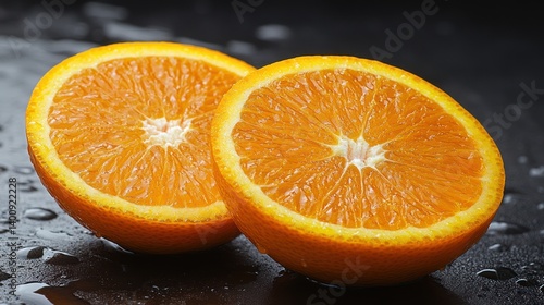 Close-up of two orange halves on a dark surface, showing the juicy segments.
