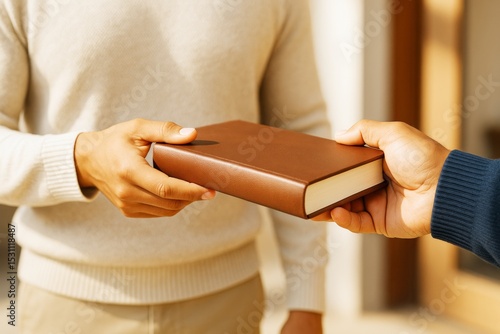 Close-up of two people exchanging a brown hardcover book with warm light and soft background in a creative concept of sharing knowledge and education.