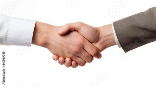 Close-up of two people in business attire shaking hands, symbolizing partnership, agreement, or a successful deal on white background.
