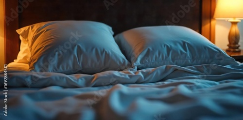 Close-up of two pillows nestled together on a bed, suggesting intimacy and whispered conversations after lights out Soft lighting creates a warm and cozy atmosphere , bed, bedroom, secret